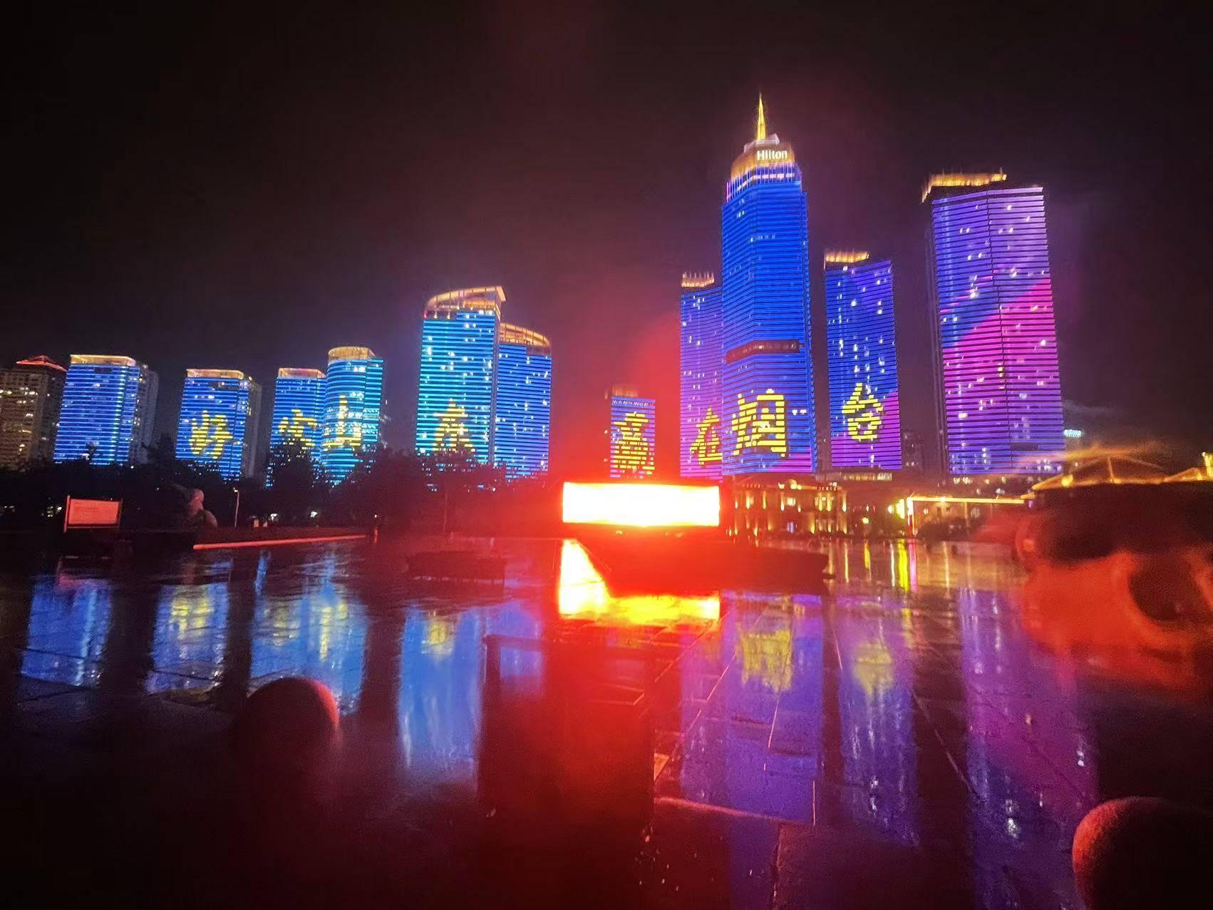 夜幕降临,滨海广场联动楼体的灯光次第亮起,“好客山东,赢在烟台!”“葡萄酒香敬英雄,山海烟台迎宾朋!”等标语在建筑间流转闪烁;观海大厦、黄海置地、黄海明珠等地标同步点亮宣传画面,与城市风光交相辉映,将“仙境海岸”的灵动与足球运动的激情完美融合。