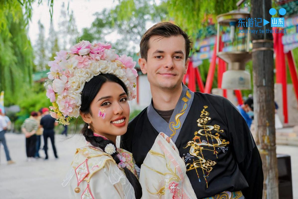 Jack和Sophia漫步于济南街头,身着汉服游览趵突泉、珍珠泉,与本地汉服爱好者互动;在大明湖上泛舟,聆听一段文学作品中有关乾隆与夏雨荷的故事;品尝地道鲁菜,感受济南独特的饮食文化。异国面容与中华传统服饰的结合,吸引了不少市民和游客的目光。