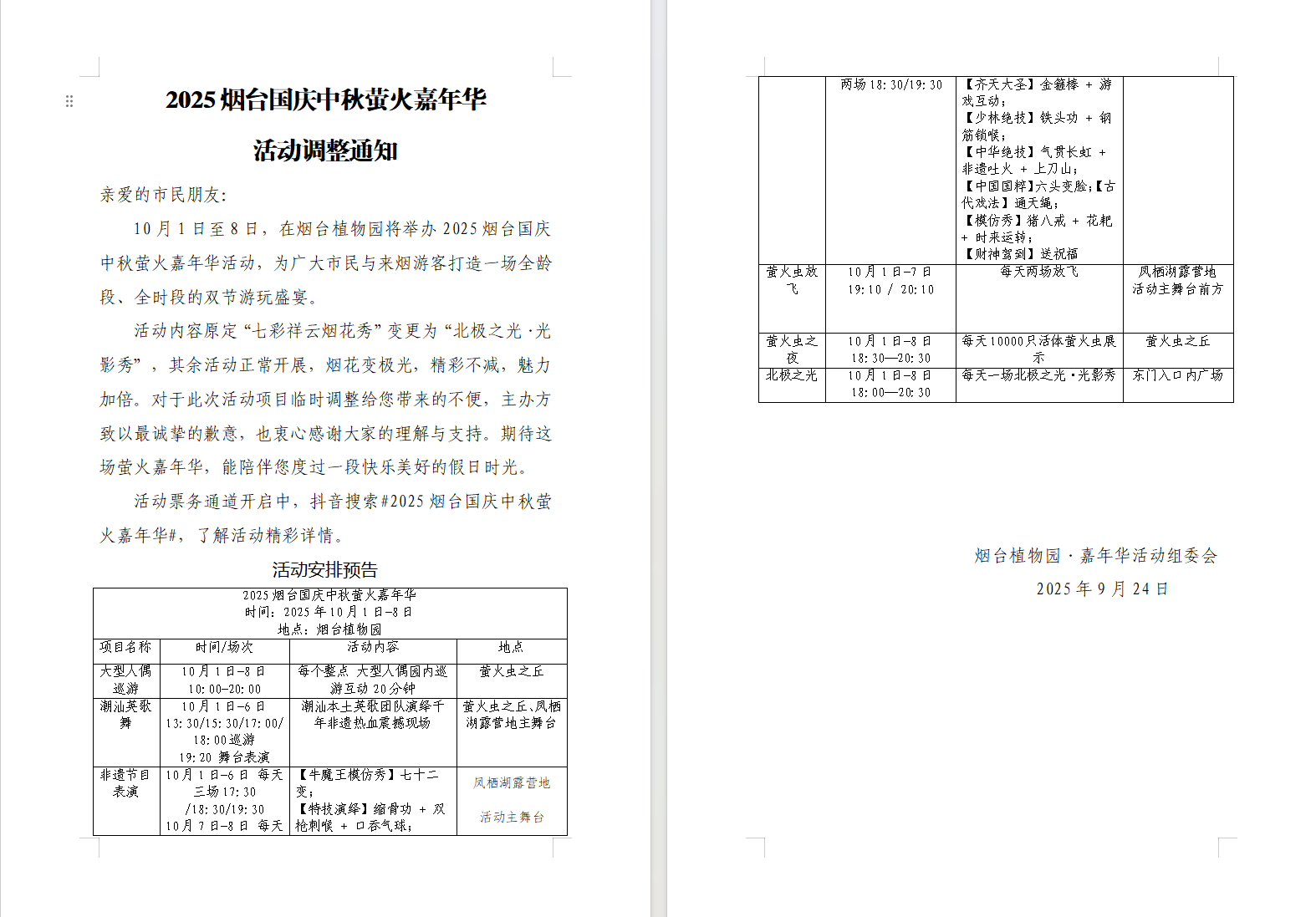 水母网讯 10月1日至8日,2025烟台国庆中秋萤火嘉年华活动将在烟台植物园举办。记者了解到,活动内容原定“七彩祥云烟花秀”调整升级为“北极之光光影秀”,其余活动正常开展。烟花变极光,精彩不减,魅力加倍。期待这场萤火嘉年华,能陪伴您度过一段快乐美好的假日时光。活动票务通道开启中,抖音搜索#2025烟台国庆中秋萤火嘉年华#,了解活动详情。