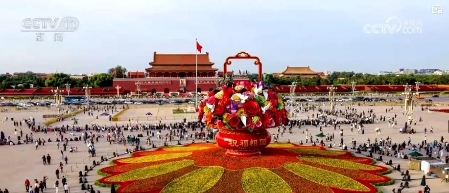 为迎接国庆,北京天安门广场及长安街沿线花卉景观布置基本就绪。9月25日,天安门广场中心花坛盛装亮相。今年广场花卉布置以“奋进新征程,建功新时代”为主题,中心花坛顶高18米。以高16米、直径12米的“祝福祖国”巨型花篮为主景。其中,加大了鸢尾、翠菊、珙桐、橄榄枝等新型花材的使用。此外,还有寓意和美的荷花、以及寓意奋进的山丹丹等花卉,表达美好祝愿。
