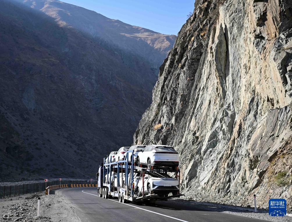 临别之际,一辆载满中国新能源汽车的大车匆匆驶过。