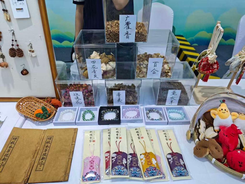 “手串是我自己设计的,使用玫瑰花、黄芪、薄荷等中药,经过研磨、压制、晾晒等工艺,手工制作而成。”山东中医药大学学生杨家硕正在展位前介绍中药香珠手串。他们的展位位于大学生中医药文创售卖区域,学生们热情推荐着茶饮包、洗发皂、熏香等各类原创中医药产品。