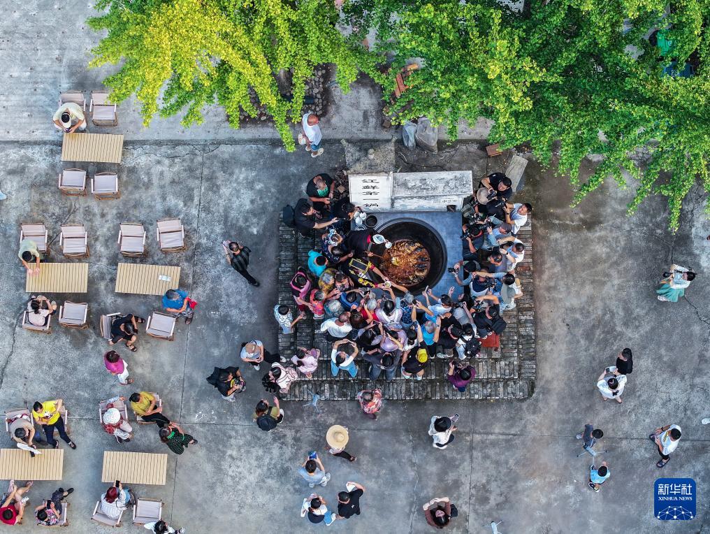 9月29日,富春江江鲜大会的主打项目“江鲜第一锅”开锅,吸引了众多游客前来品尝(无人机照片)。“江鲜第一锅”是在直径1.5米的大铁锅中炖煮上百斤的江鲜鲢鱼,香气四溢。