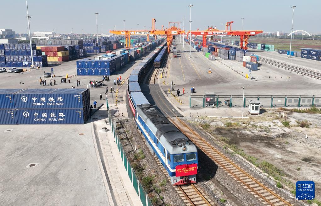 10月13日,伴随嘹亮悠长的鸣笛声,一列满载家电产品、汽车配件等货物的中亚班列从中铁天津集装箱中心站出发,将经由霍尔果斯口岸出境,驶向哈萨克斯坦等地。