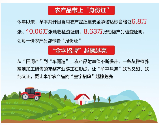 不仅要“吃得美味”,更要“吃得安心”。从田间到餐桌,每一环都不容马虎。今年以来,牟平共开具食用农产品质量安全承诺达标合格证6.8万张、10.06万张动物检疫证明、8.63万张动物产品检疫证明,让每一份农产品都带着“身份证”;“春风护农”农资专项治理、畜禽屠宰领域专项执法行动雷霆出击,17起立案、1.86万元罚款、2.2万元违法财物没收,斩断危害食品安全的链条。