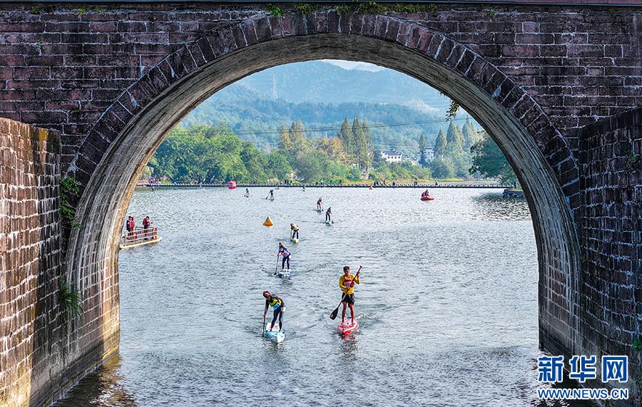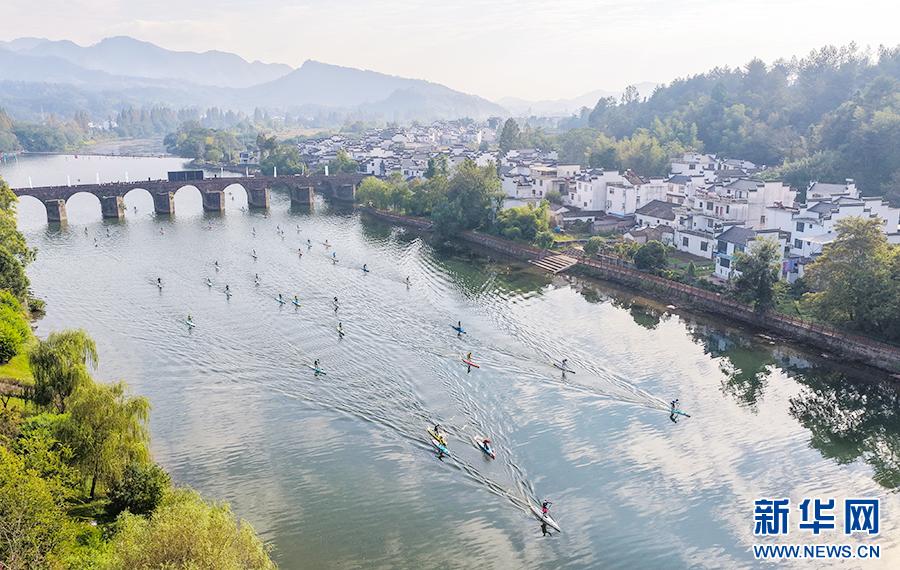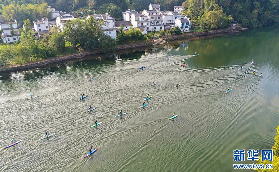 10月25日,安徽省黄山市休宁县齐云山横江水域,参赛选手正挥桨竞逐(无人机照片)。