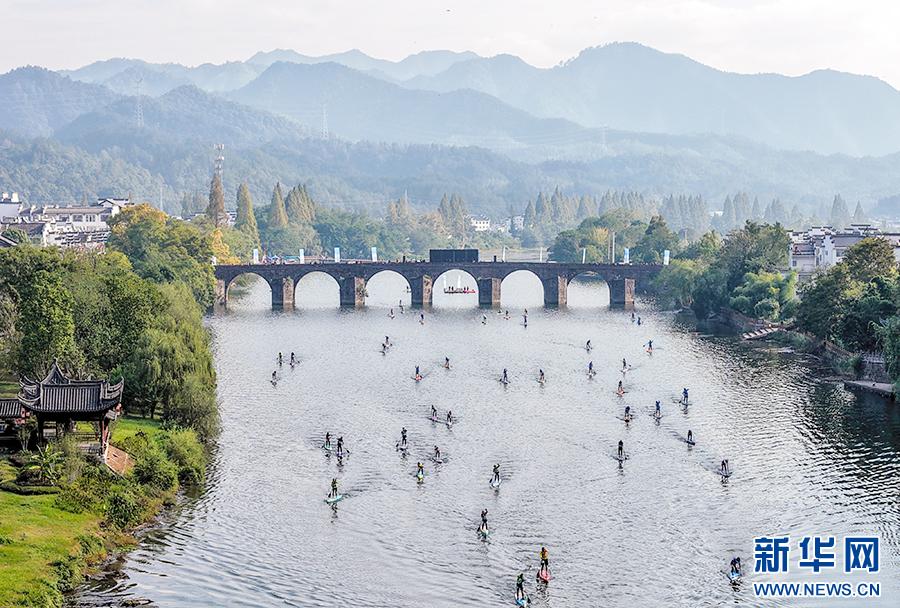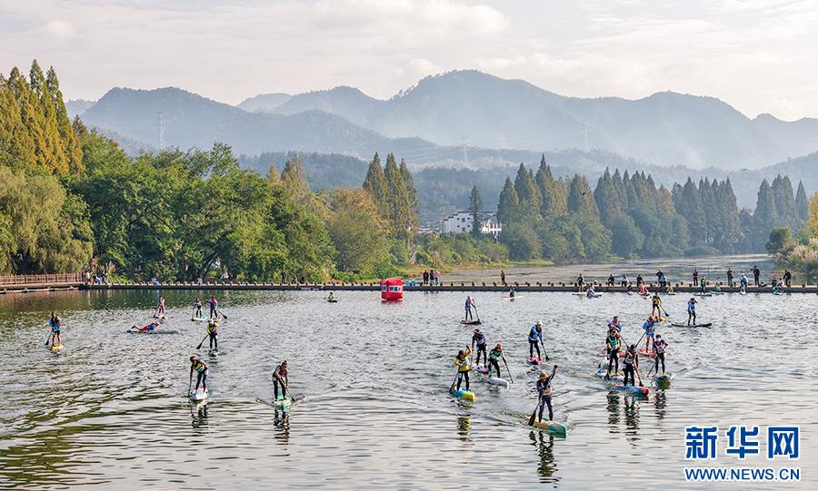 当日,2025年安徽省桨板公开赛在黄山市休宁县齐云山横江水域火热开赛。赛事吸引了来自长三角地区近200名桨板爱好者参与,在齐云山秀美的山水画卷间挥桨破浪,激烈角逐。新华网发(施亚磊 摄)