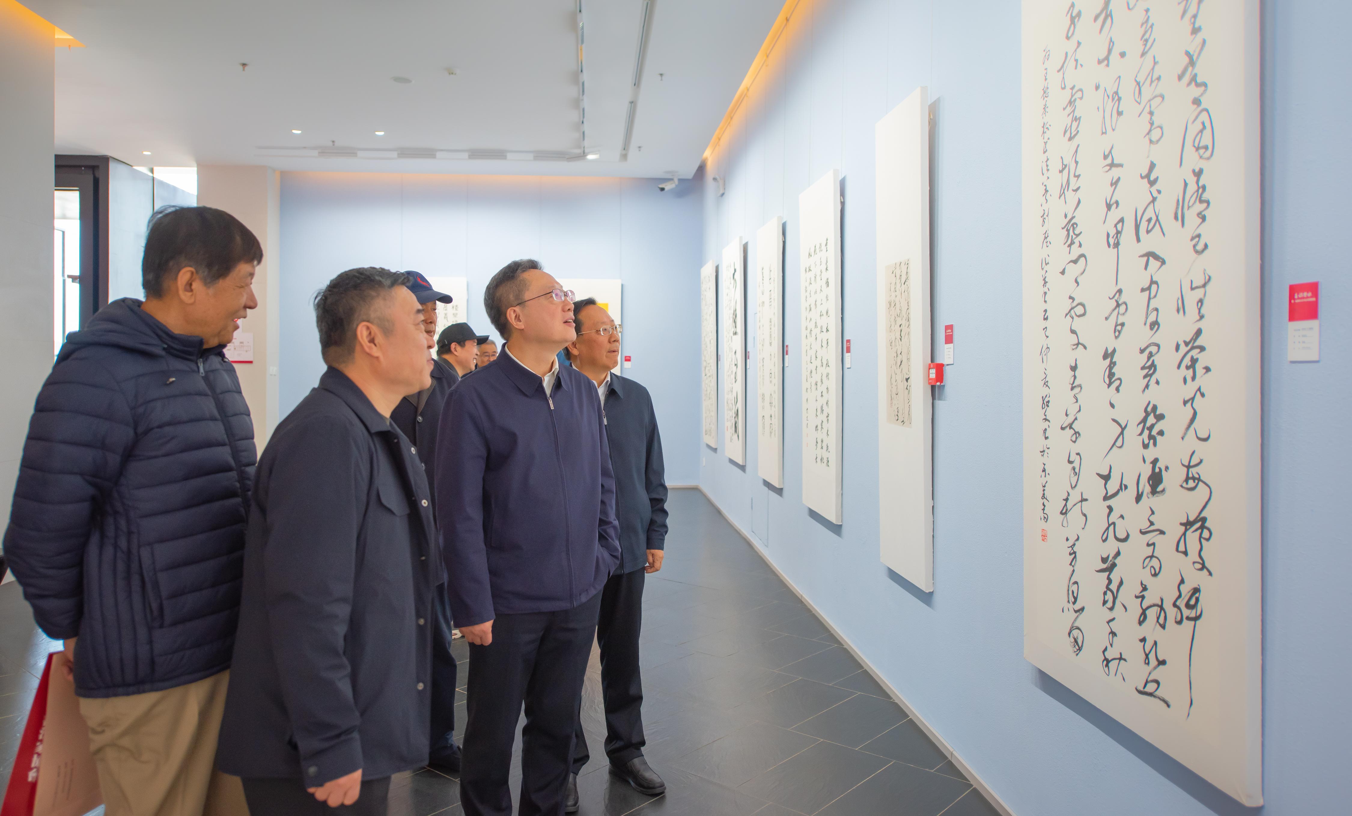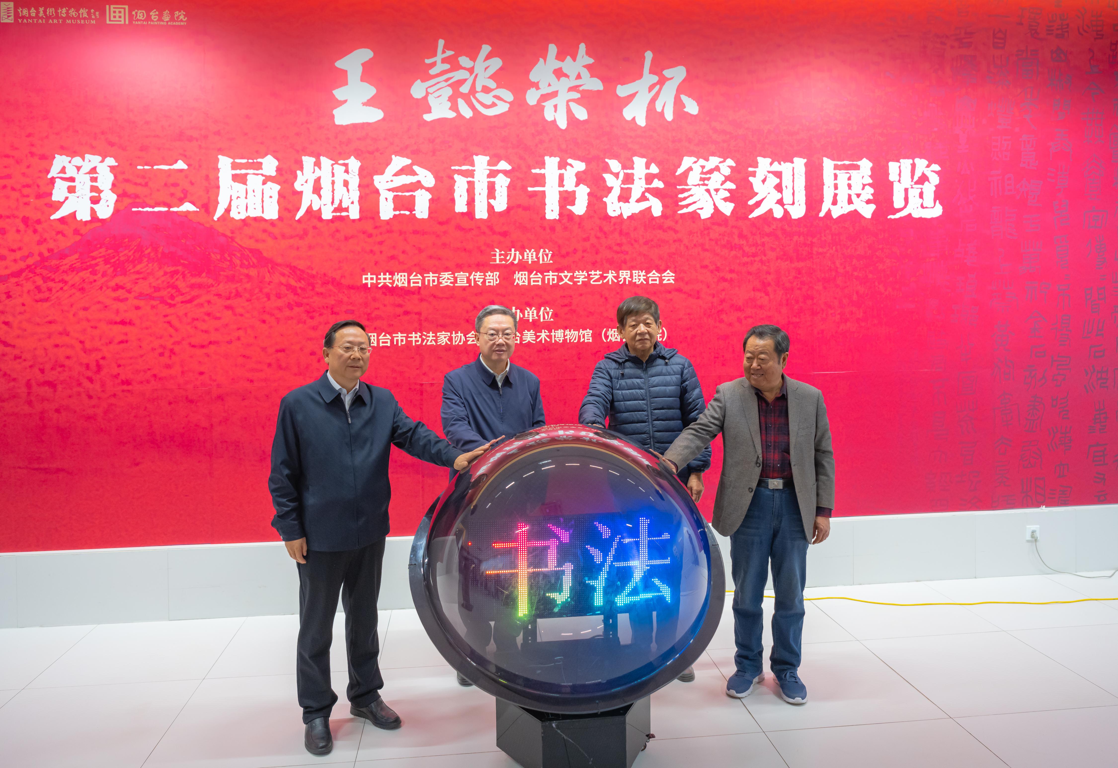 开幕式最后,吕波、王建国、宋作新、宁兰智共同为“王懿荣杯”烟台市第二届书法篆刻展览启幕。