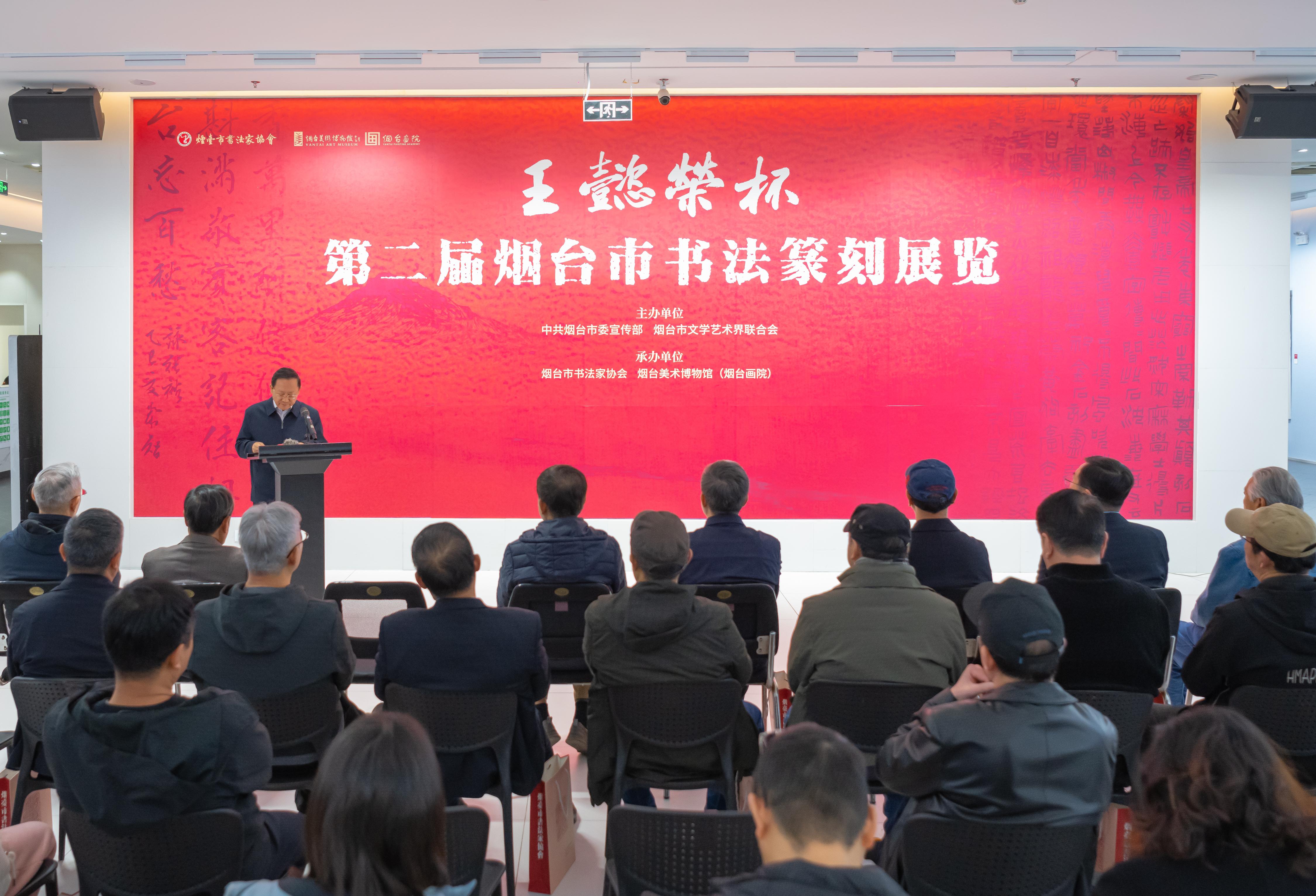 水母网10月28日讯(记者 王蔚 通讯员 孙秀杰 姚南通摄影报道)2025年10月28日上午9:30,由中共烟台市委宣传部、烟台市文学艺术界联合会主办,烟台市书法家协会、烟台美术博物馆(烟台画院)承办的“王懿荣杯”烟台市第二届书法篆刻展览在烟台美术博物馆开幕。烟台市相关领导、参展作者代表、高校师生、书法爱好者等二百余人。开幕式由烟台市文联党组成员、副主席张绍文主持。
