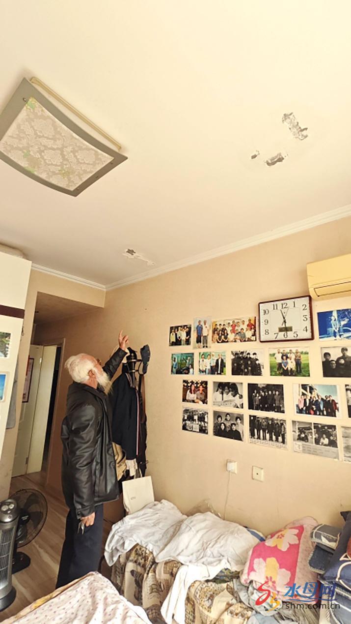 随后,李大爷找邻居和小区物业工作人员交涉,漏水问题才得以解决。李大爷担心屋顶漏水浸泡掉墙皮砸到人,被迫在客厅沙发上睡了两个月。让李大爷上火的是,因为漏水导致屋内的地板、家具都不同程度受损,与邻居协商赔付事宜未果。李大爷便求助物业公司,希望他们能出面协调解决,但一年过去了也未能如愿。