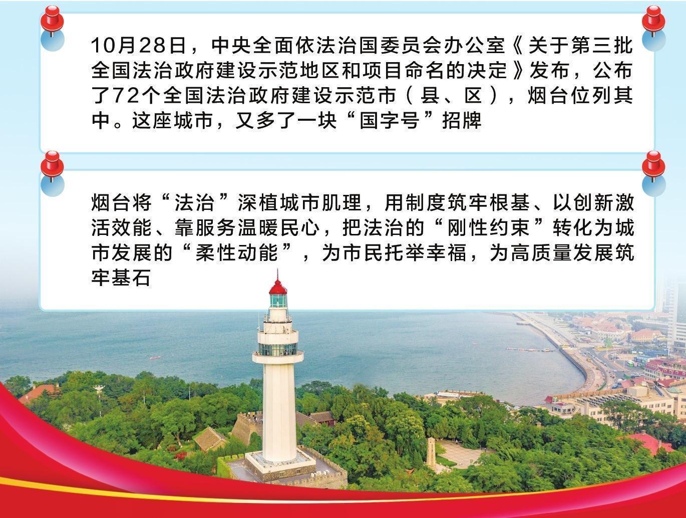 10月28日,《人民日报》发布中央全面依法治国委员会办公室《关于第三批全国法治政府建设示范地区和项目命名的决定》,公布了72个全国法治政府建设示范市(县、区),烟台位列其中。这座城市,又多了一块“国字号”招牌。