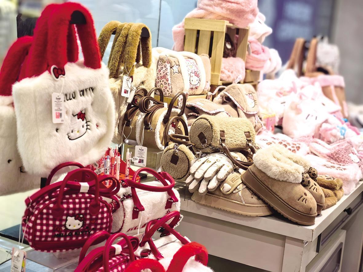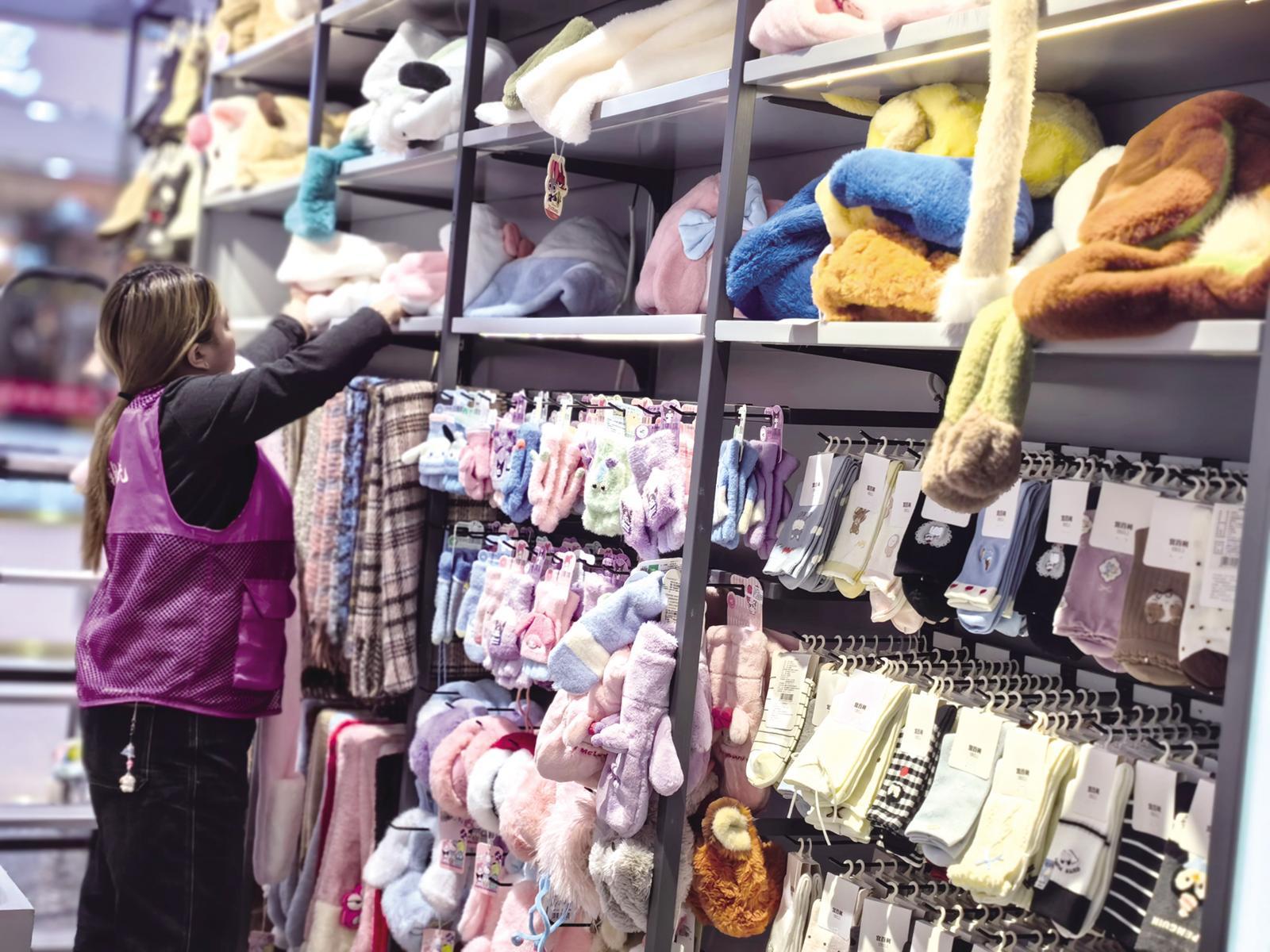 一家精品店内,专门设置的“冬日氛围感 暖心好物”专区人气爆棚。货架上整齐摆放着围巾帽子、毛绒拖鞋、加绒睡衣等各类商品,不少家长正带着孩子挑选卡通造型的棉拖鞋。