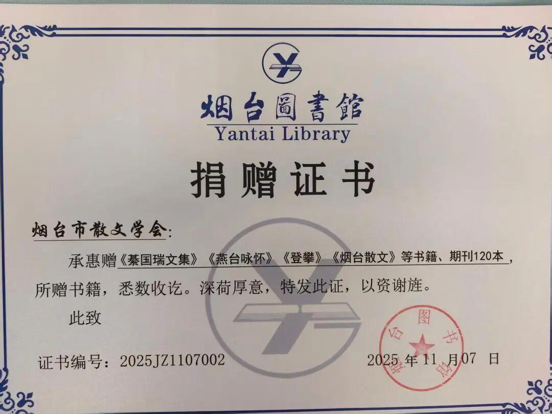 烟台市散文学会自2007年成立以来,始终致力于推动散文创作繁荣、弘扬地方文化,此次捐赠是学会践行文化公益、回馈社会的重要举措。学会希望通过展示和推广会员们的书籍、报刊,吸引更多的文学爱好者“爱读书、读好书、善读书”,激励会员创作出更多更优秀的文学作品,共同传承和弘扬中华文脉,一起讲好“烟台故事”,也希望会员们能有更多更好的作品摆放到图书馆的“烟台市散文学会文献专架”上,借助图书馆的传播优势,让更多的读者读到会员们的杰作,扩大作品的阅读范围和传播面。