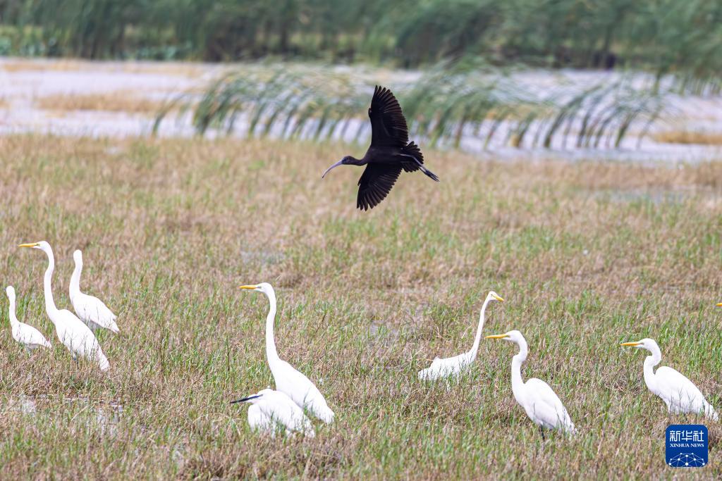 在海南昌江海尾国家湿地公园拍摄的彩鹮与鹭鸟群(11月5日摄)。