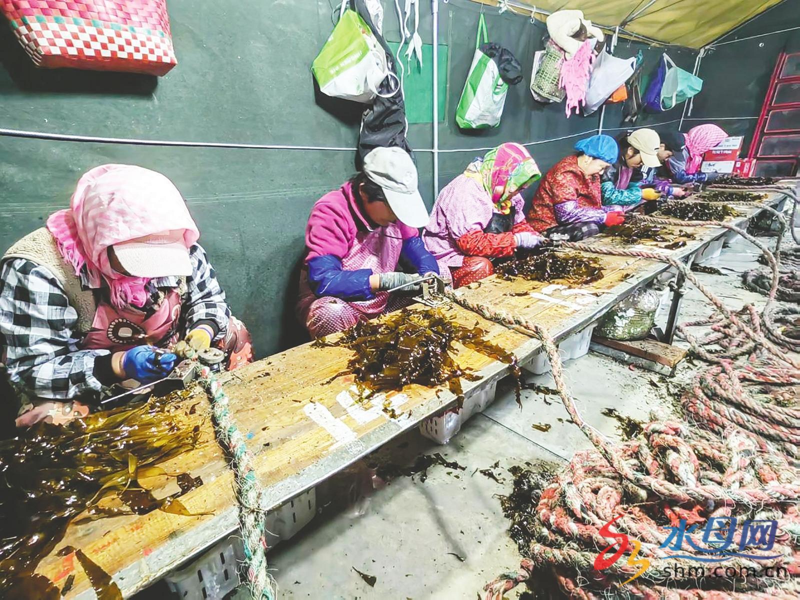军绿帐篷里,养殖场内外,大家身穿塑料围裙或水衣水裤,脚踩长筒水靴,井然有序地忙着自己的工作:有人从海上采收、运回海带苗,有人用海水浸透夹苗用的尼龙绳,有人检查夹苗质量、搬筐吊装,渔嫂们则专职夹苗。这一整套活儿,人机配合得行云流水,环环相扣。