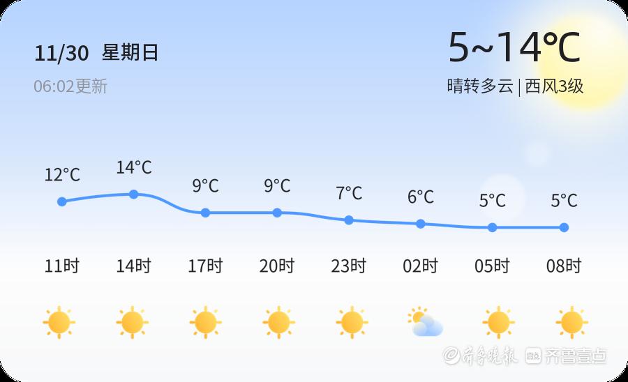 今天是11月30日,星期日,农历十月十一。烟台市迎来晴转多云的天气,全市各区的气温在5℃至14℃之间,当前温度为7.5℃,湿度为62%,风向为西风3级。市民朋友们请注意适时添减衣物,做好保暖措施。