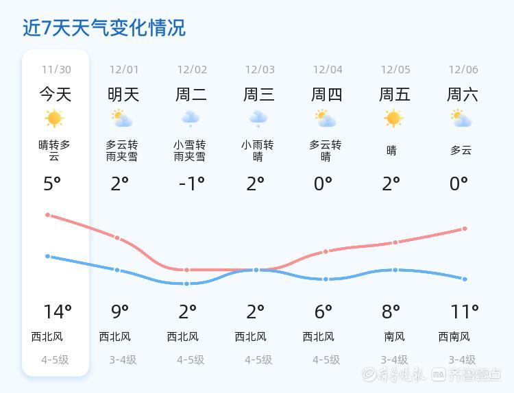未来三天,烟台市的天气将经历小雪、雨夹雪和小雨的交替变化,气温波动较大,最低气温将达到-1℃,最高气温为14℃。
