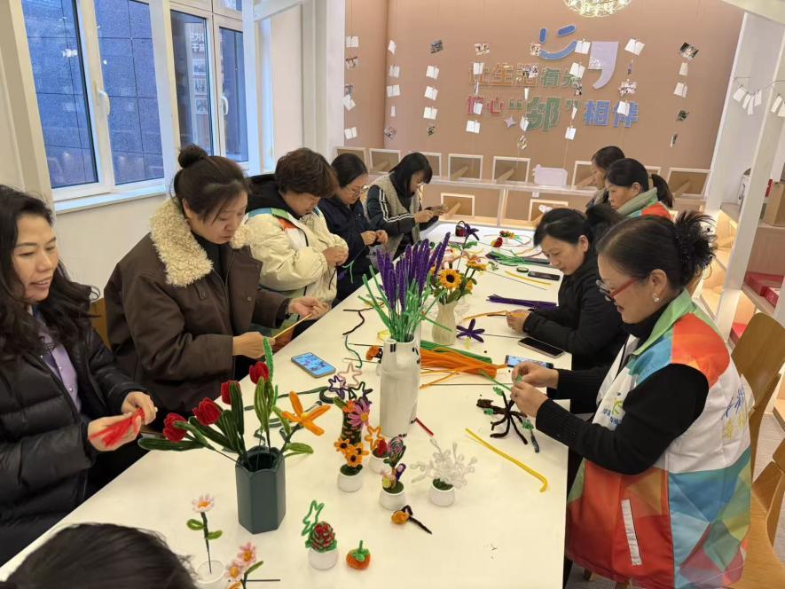 平平无奇的扭扭棒在大家手中渐显生机:王先生专注制作红玫瑰,“要做最艳的送给女朋友”;几位小朋友在家长陪伴下合力扎制圣诞树,绿枝缀红饰满是童趣;社区小杨陪独居刘奶奶做“多肉植物”,一老一少默契配合,笑声不断。不同年龄层的居民沉浸创作,陌生的邻里在交流技巧中渐渐熟络。