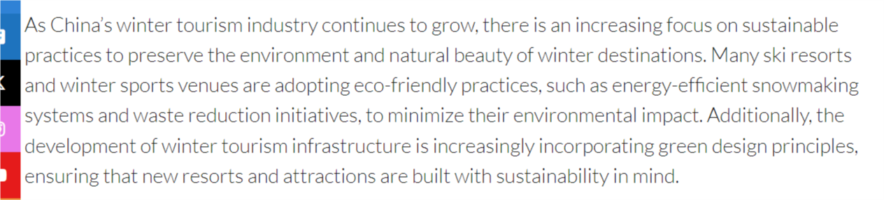 文章还说,随着中国冬季旅游产业的不断壮大,可持续发展理念、环保实践也日益受到重视。中国正成为越来越有吸引力的冬季旅游目的地。