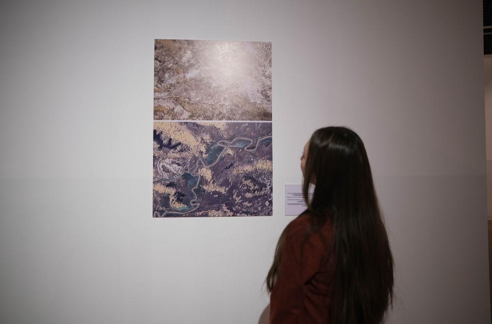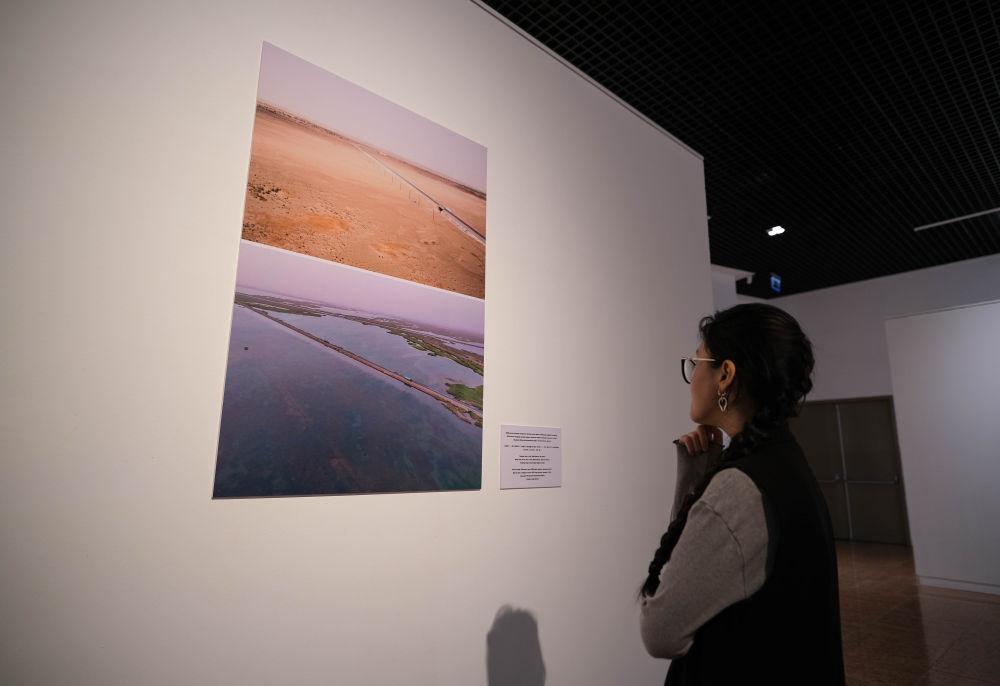 在图片展上,两张新疆塔里木河畔治沙工程的拼版对比照片给很多参观者带来了深深的震撼。