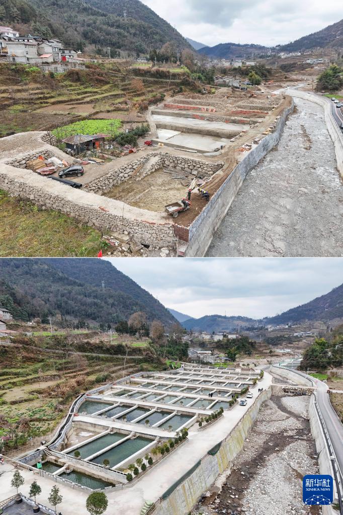 拼版照片:上图为建设中的冷水鱼养殖基地和新的混凝土河堤(1月25日摄,无人机照片);下图为已投入使用的冷水鱼养殖基地(12月24日摄,无人机照片)。