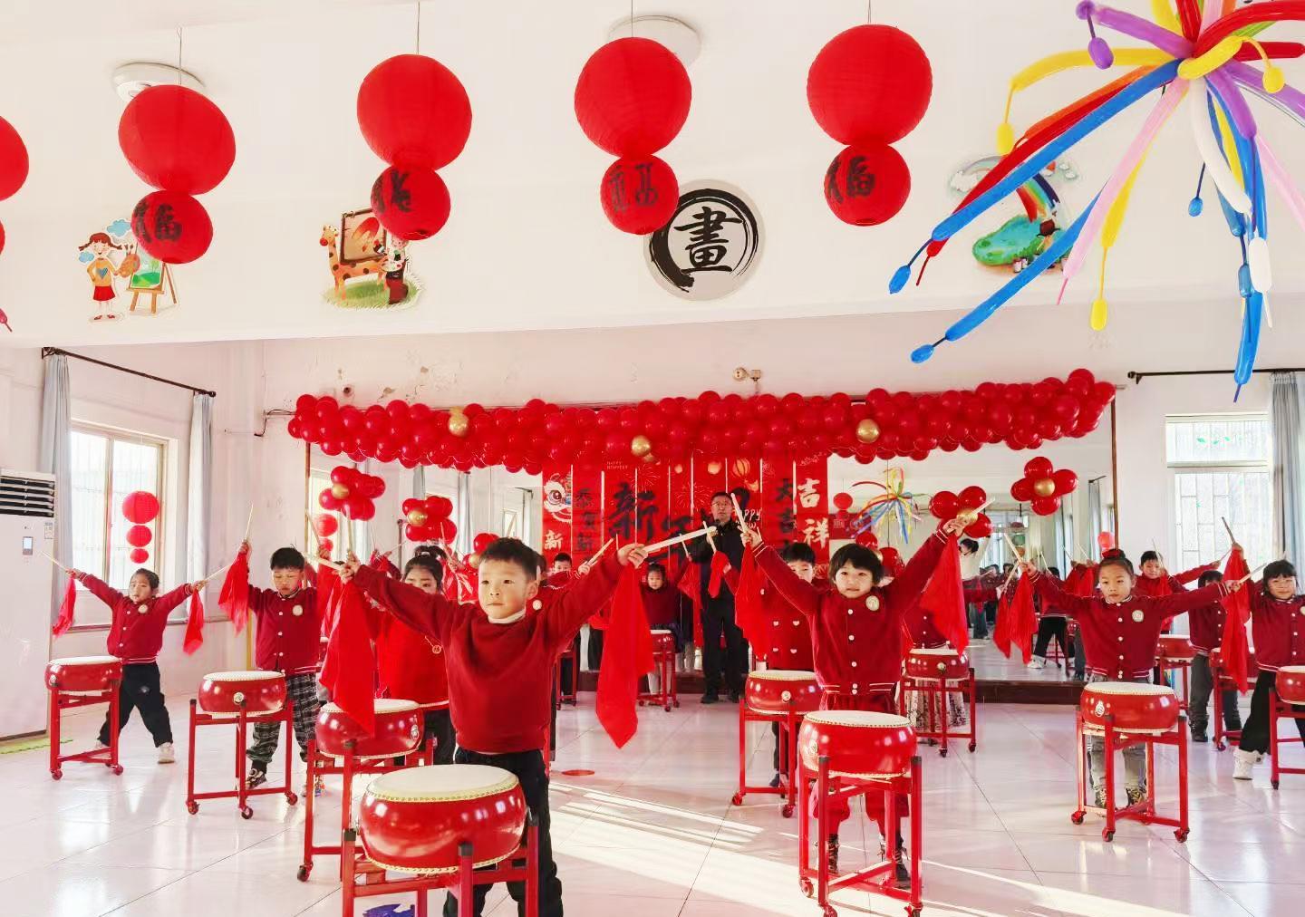 活动室里,红灯笼、红气球将空间装点得暖意融融,“福”字与新春装饰更添喜庆氛围。孩子们端坐在朱红小鼓前,稚嫩的小手握着鼓槌,随着节奏扬起手臂——鼓点虽不似专业乐手那般精准,却透着蓬勃的童趣;挥舞的红绸跟着动作轻摆,与统一的红衣相映成趣,把活动室衬得愈发红火。带队老师站在队伍后侧,笑着引导孩子们调整姿势,清脆的鼓点与孩童的欢笑声交织,成了冬日里最鲜活的旋律。