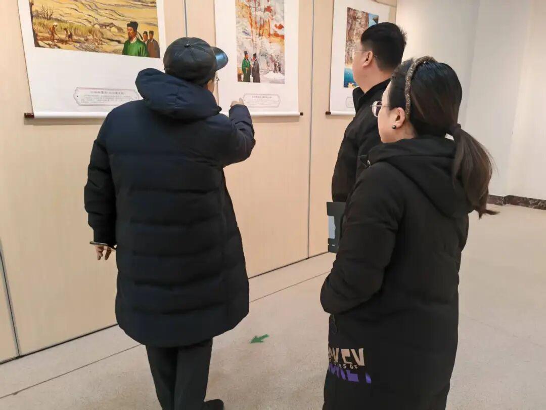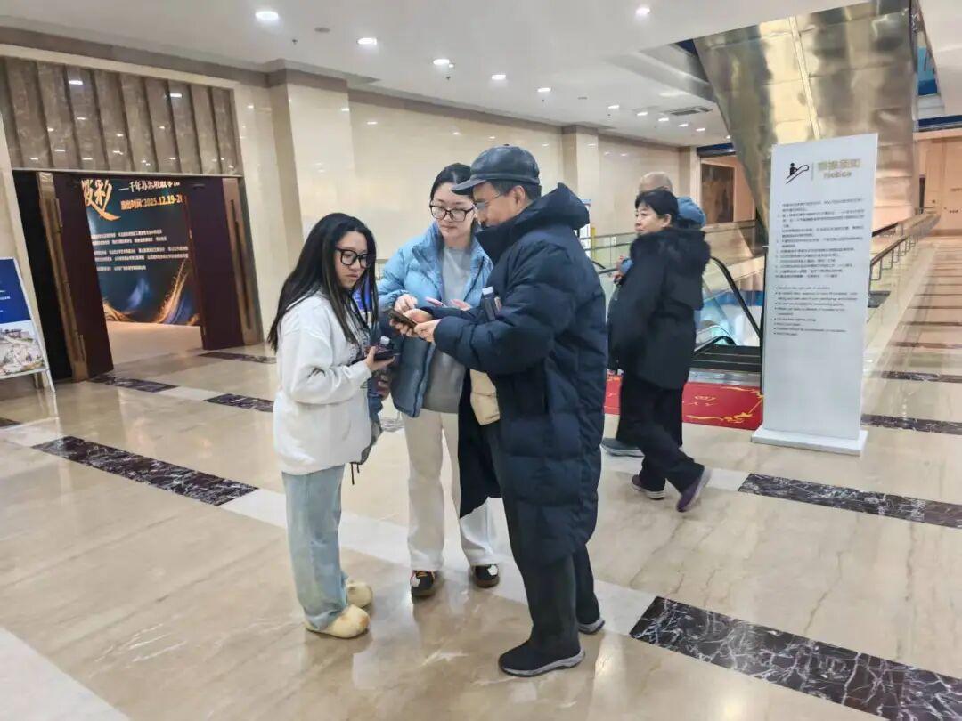 大哥比较关注学生群体,在观展过程中,大哥遇到了山东商务职业学院几位来参展的学生,他也是这所学院的产业教授,便亲自上前给他们讲解“海石坡彩·登州青云”的来历,以及插画制作过程,又向他们介绍插画背后的故事。借海石与AI焕新,一场文化接力,让五日知州的文脉,经古今交融的艺术形式绽放光彩。当千年风骨遇上当代创意,沉睡的历史便有了温度与活力,学生们为这场跨越千年的文化接力动容。