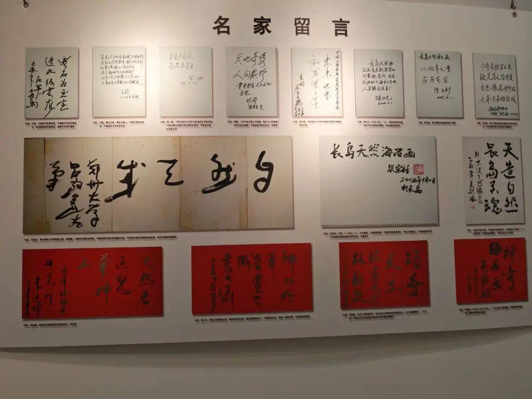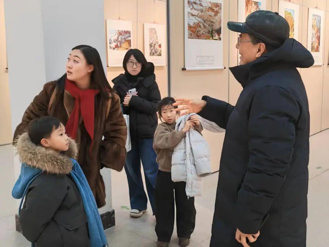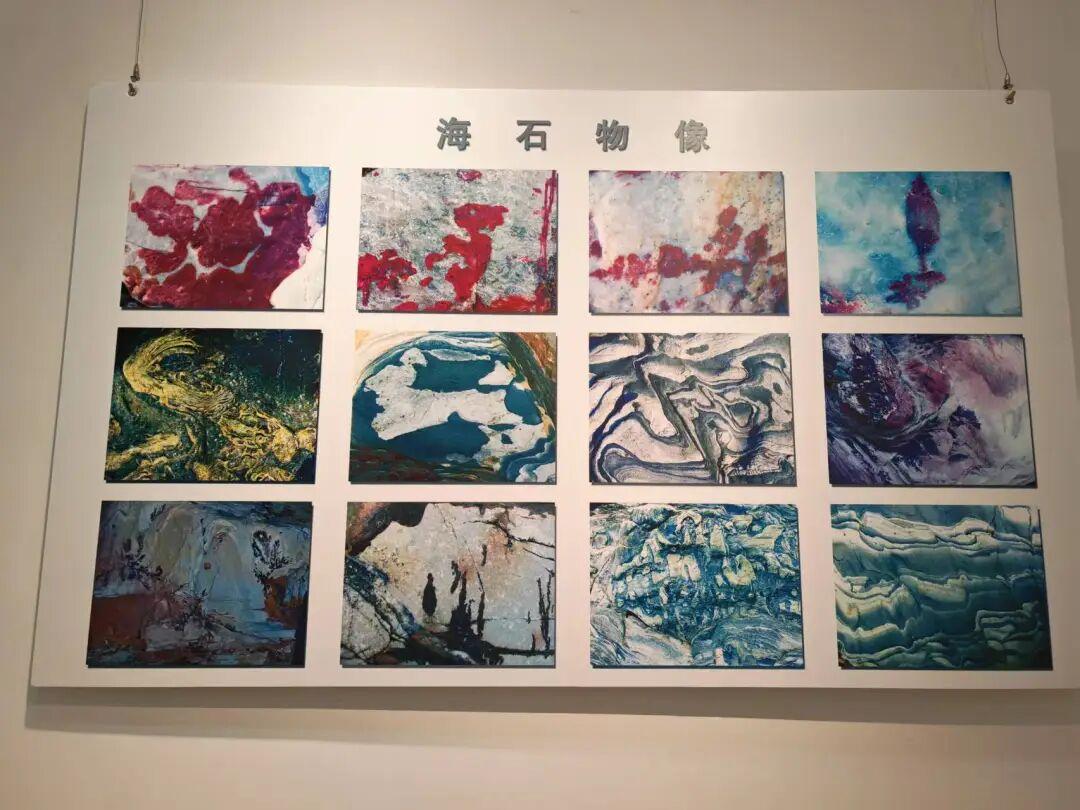 他告知这些天陆续有不少来观展的游客及专业人士,其中某一上午就来了沈阳、内蒙古、济南、淄博、青岛及市内10余帮观众。这时展厅内有几位从马鞍山来的客人,正带着孩子观展。大哥笑容可掬地迎向前,指着一幅幅画面向她们介绍,这些石画,不是单拍某一整块石头,而是截取石面或是崖壁局部拍摄。这些海边石头的成分包括石英岩、板岩、页岩等,其中,石英岩的硬度很高,达到7度,可以炼钢炼铁。接着他叮嘱这几位女士,要带孩子多看看这些以传统文化嫁接现代智能的画展,让他们了解地理地质、摄影绘画、文学文史和Al知识,提高他们的文化素养和动手能力。