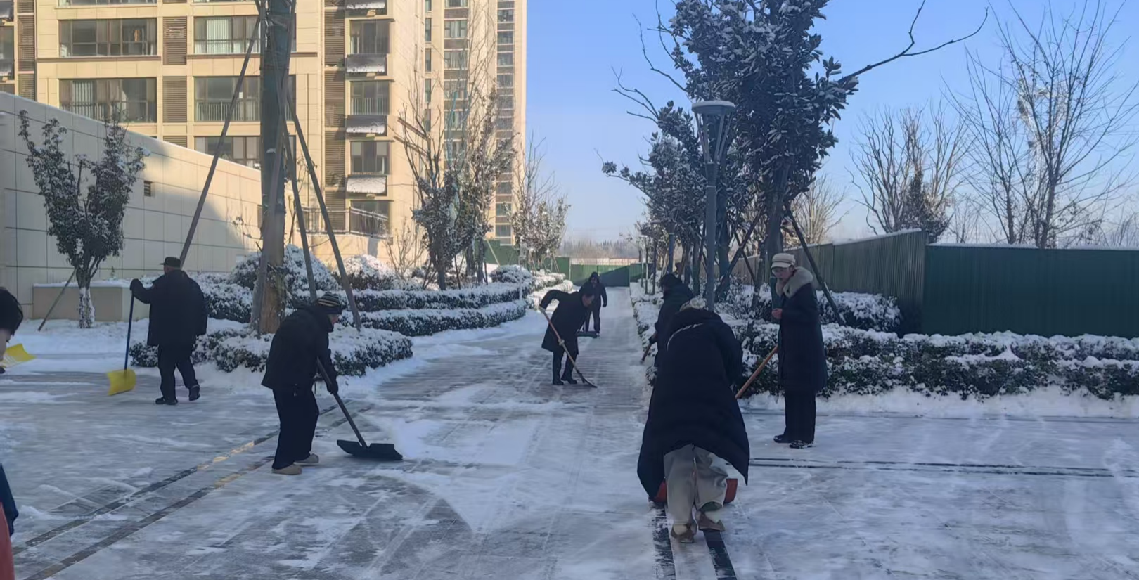行动中, 党员干部带头冲锋,手持铁锹、扫帚,聚焦小区主干道、单元门口、坡道台阶等重点区域,奋力铲除积雪、破除积冰;物业工作人员充分发挥专业优势,调度铲雪设备高效作业,在易滑路段铺设防滑垫、设置警示标志,形成“党员带头、物业联动、分工协作”的清雪合力。寒风中,“党建红”与“物业蓝”交织成冬日里最暖心的风景线,经过数小时奋战,园区公共区域积雪全面清除,为居民开辟出安全畅通的“暖心通道”。