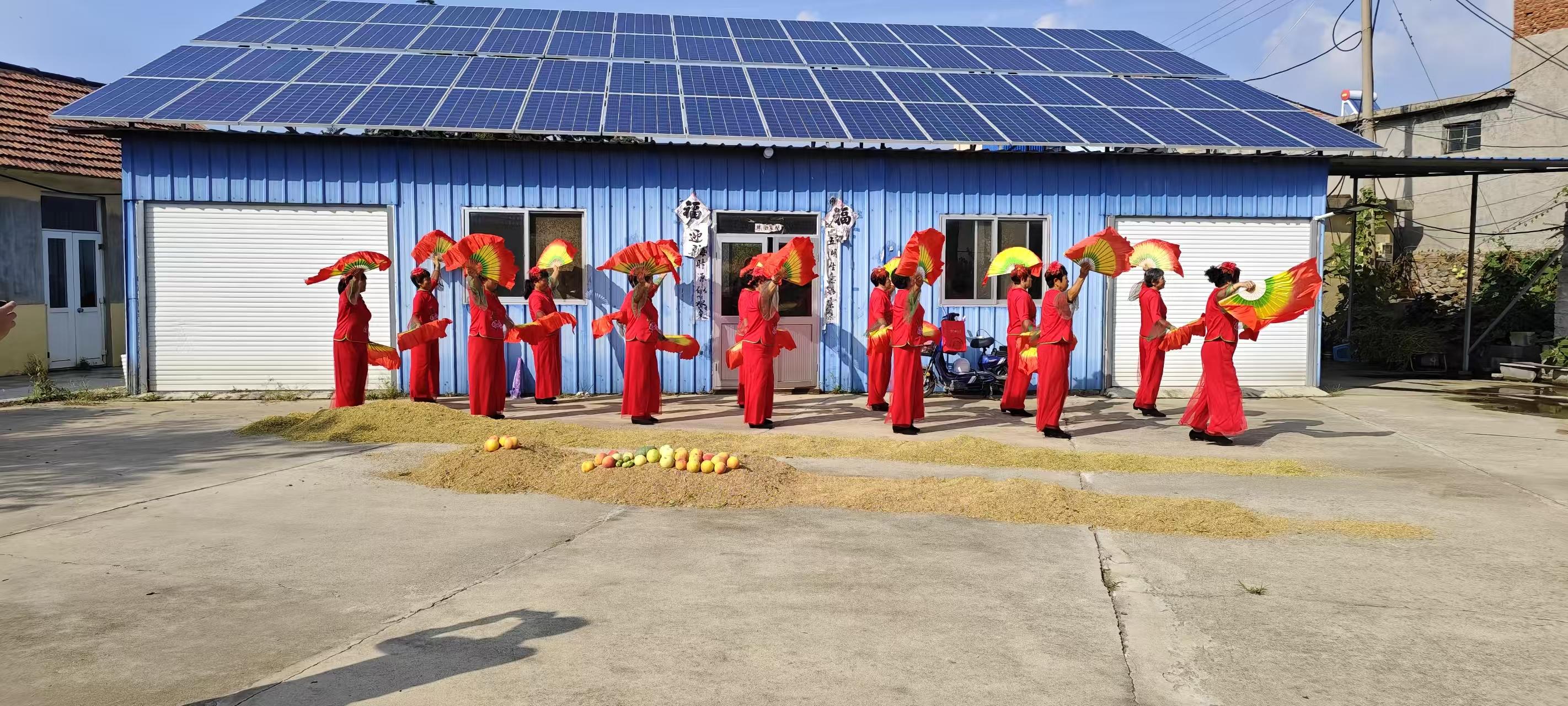 伴随着欢快的节奏,村民们身着红衣翩翩起舞,红绸飞扬间,将丰收的喜悦与对新年的期盼尽情挥洒。院落上方的光伏板熠熠生辉,与地面晾晒的稻谷、门前摆放的鲜果相映成趣,勾勒出一幅产业兴旺、生活富足的乡村新画卷。