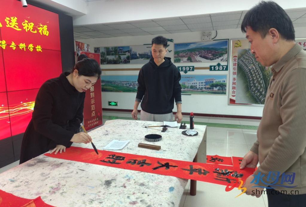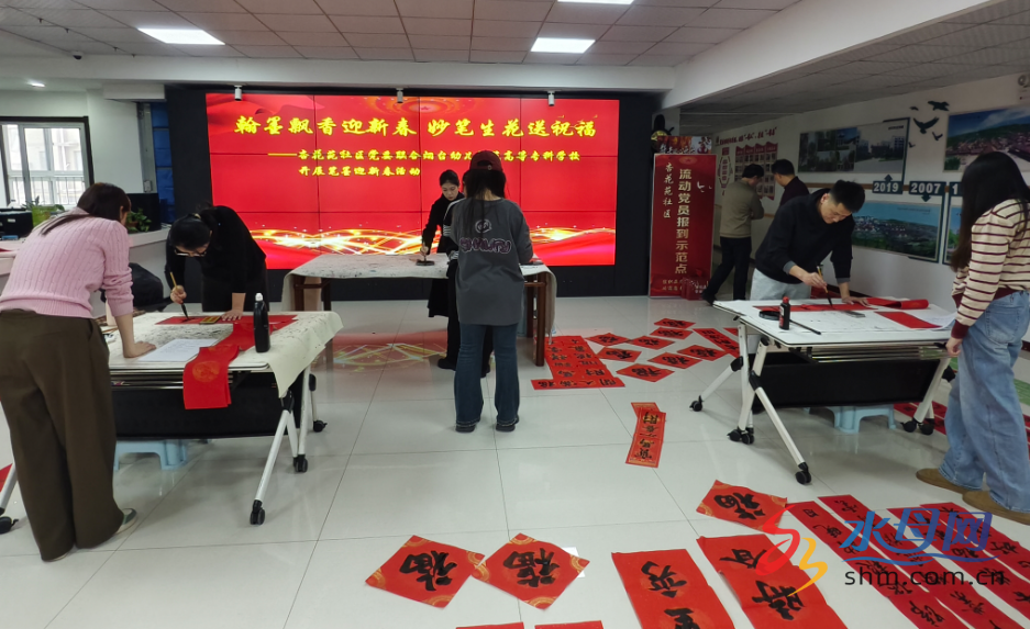 活动首站设于蓬莱区杏花苑社区党群服务楼,现场墨香四溢、暖意融融。该校艺术教育系党支部党员老师及志愿者们铺纸研墨、挥毫泼墨,以笔为媒传递新春美好期许。楷书端庄、行书飘逸,一副副寓意吉祥的春联,一个个饱满喜庆的 “福” 字跃然纸上,将对新年的祝福、对美好生活的向往凝于笔墨之间。社区居民们闻讯前来,或驻足观赏、或挑选心仪的联语,拿到春联和福字的居民脸上洋溢着幸福笑容,现场欢声笑语不断,浓浓的年味在墨香与温情中悄然蔓延。