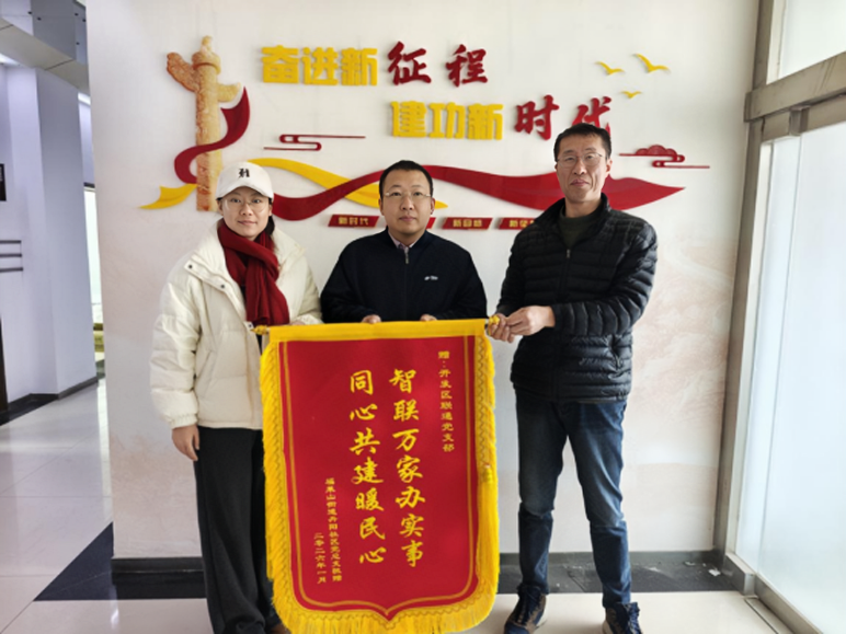 水母网2月12日讯(通讯员 陈文文)2月10日下午,福莱山街道丹阳社区党委副书记刘思羽一行,将一面镌刻着“智联万家办实事,同心共建暖民心”的锦旗送到烟台联通开发区党支部,代表社区及全体居民,向其长期以来在“双报到”共助共建工作中的大力支持与无私奉献,表达了最诚挚的感激之情。