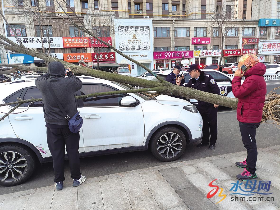 “这棵树一天前被大风刮倒,正好砸在了路边停放的轿车上。”一边向记者介绍着情况,孙警官一边下车往围观群众方向走去。