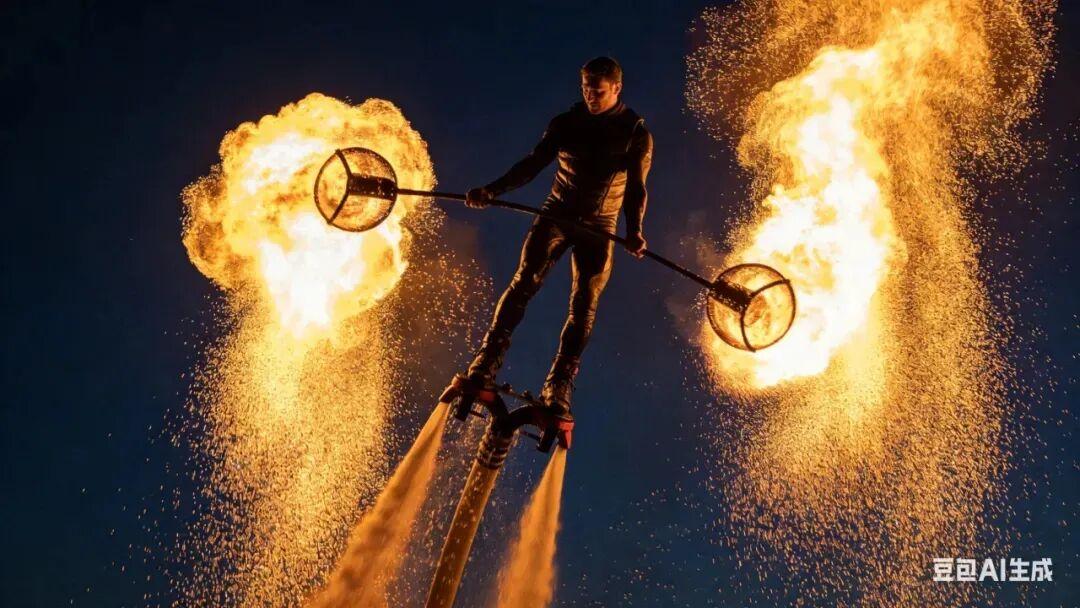 空中火壶(夜晚3场):比打铁花还震撼!水上飞人飞至空中,手持燃烧的火壶旋转,火焰划破夜空,水面倒影如仙境。
