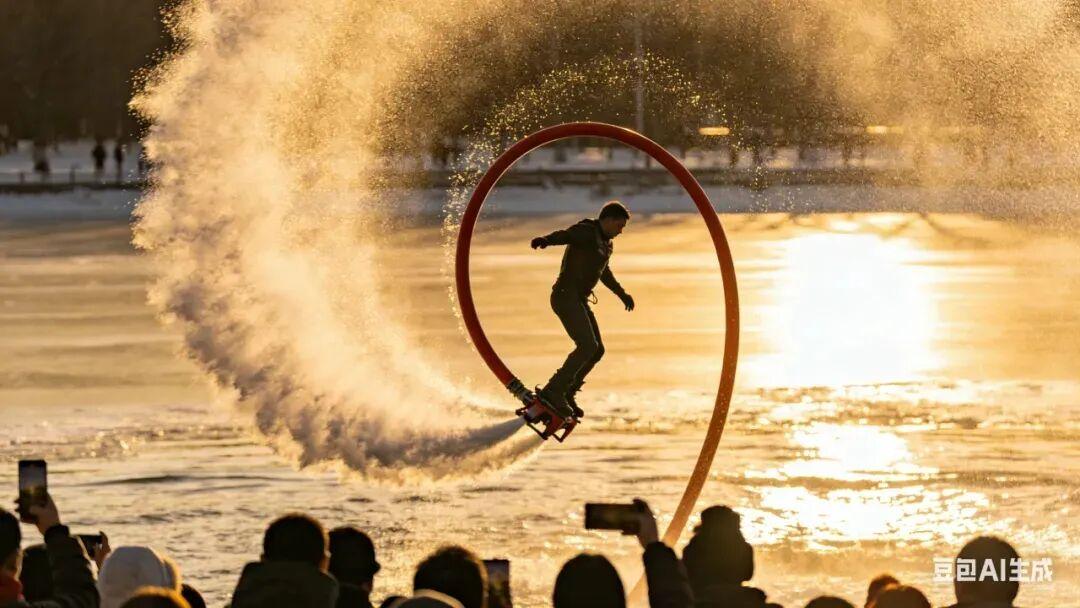 水上飞人(白天2场):表演者脚踏喷射装置,腾空而起,在湖面上翻飞旋转,炸翻全场。