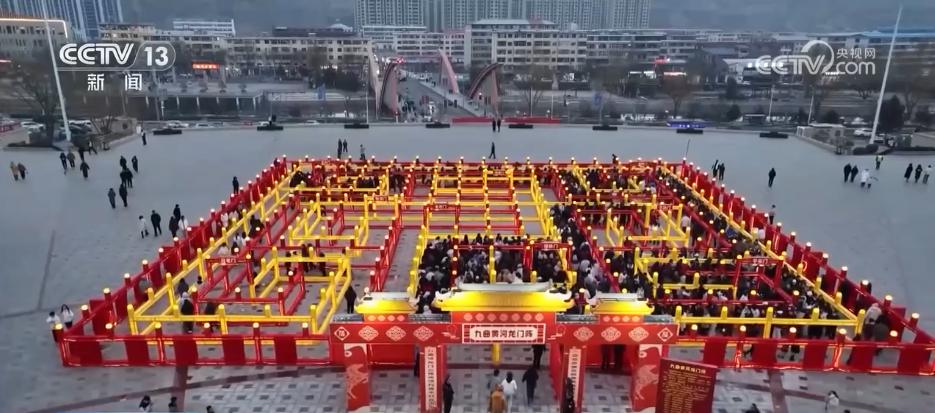 山西太原市娄烦县的转九曲,以灯阵布局,因其形如九曲十八弯的黄河而得名,设有状元门、吉祥门、得胜门、子孙门等九道门。群众手持彩灯有序穿行,在蜿蜒灯路中祈福纳祥。