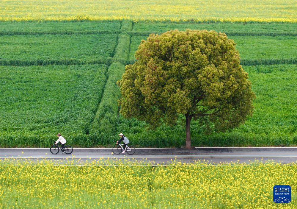 两名游客骑行在四川省峨眉山市九里镇汪家村的油菜花田旁(3月6日摄,无人机照片)。