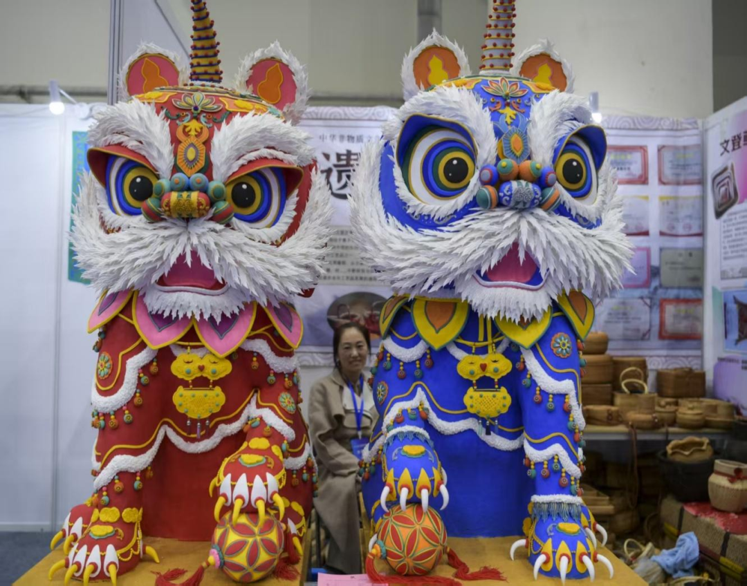2025年底的山东工艺美术博览会上,聚光灯下一对名为《东方醒狮》的巨型泥塑作品惊艳了全场。右侧的红狮通体红似火焰,左侧的蓝狮则蓝若深海。它们昂首挺胸,浑身披满了繁复至极的花纹,从眉心到脊背,从胸甲到足尖,每一寸都缀满了或如宝石或如鳞甲的精巧装饰。最令人叹为观止的,是它们的双目与鬃毛。那双目圆睁,眼白、虹膜、瞳孔乃至瞳仁里的高光,都被细致入微地刻画出来,眼波流转间仿佛凝聚了日月精华。而头部的鬃毛,是用一种特殊的技法,一丝丝、一缕缕地粘贴而成,蓬松柔软,带着倔强的生命力,与醒狮昂扬的姿态相得益彰。狮爪之下,一枚彩球静静卧立,仿佛轻轻一碰,便能灵动滚动。