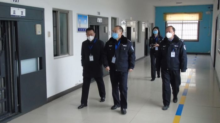 张新忠(左一)陪同菏泽市公安局监管支队支队长检查看守所工作。