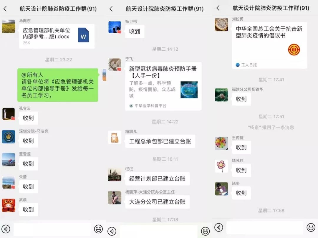 为了及时跟进疫情防控情况,航天建设所属航天设计院党员干部主动要求,轮流电话值班,群众积极主动参与,哪怕凌晨响起的消息提示音,也总有人在第一时间传递各方消息。虽不在工作岗位,却自发形成了“007”工作制。