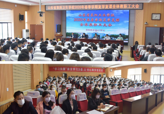 水母网5月21日讯(通讯员 董广云)5月19日下午,山东省莱阳卫生学校在电教室召开2020年春季学期复学复课教职工大会。学校党委书记、校长冯开梅出席并讲话,党委副书记、副校长田仁礼主持,校领导孙秀明、石少婷、李顺见及全体教职工参会。