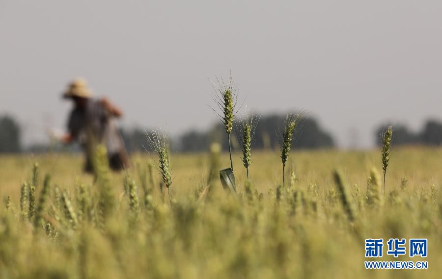 5月20日,河南省武陟县大虹桥乡西小虹村农民在麦田里忙碌。 当日是二十四节气中的小满。 新华社发(冯小敏 摄)