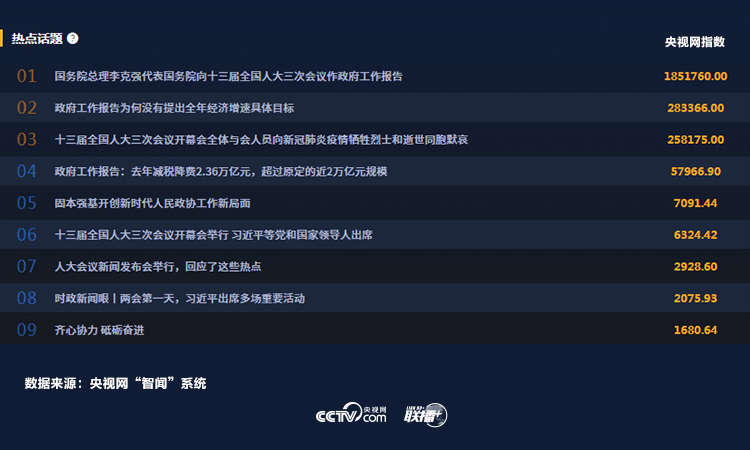 截止到22日下午两点,智闻系统“央视网指数”综合监测的热点话题显示,排在前四位的热点话题都与人大开幕会有关。