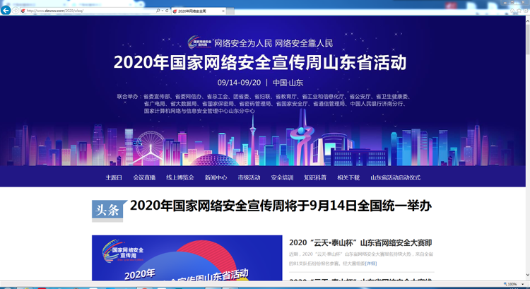 网络安全宣传周山东省活动将于9月14日在济南启动。9月9日,本次活动官网(http://www.dzwww.com/2020/wlaq/)正式上线。活动官网设线上博览会、主题日、市级活动、安全培训和知识科普等9大板块,通过图文、短视频、直播等多种形式,全面呈现活动最新进展和山东省网络安全方面的亮点成就。