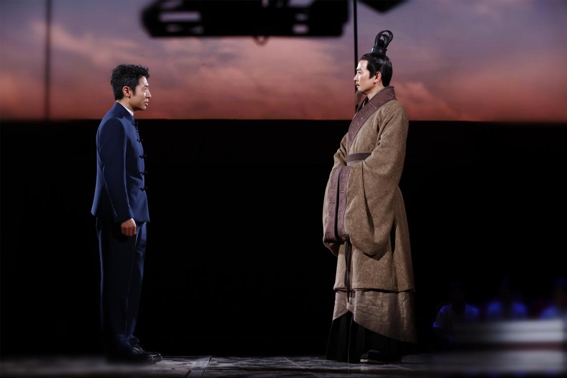 值得期待的是,尽显孔子精神高光的“陈蔡绝粮”,被演员们演绎得荡气回肠。这一事件也是周游列国十四年中最难的一段经历,孔子与众弟子被困于陈蔡之间,绝粮七日。子贡受命于危难,前往楚国求援。他们虽饱经苦难,但一路同行,一路坚定,如“岁寒松柏”身处逆境而依然挺立,哪怕只剩下“一碗薄粥”,仍觉“味道甚美”。正如舞台上撒贝宁所说:“追寻大道的苦,患难真情的甜,都在这一碗薄粥里了!”