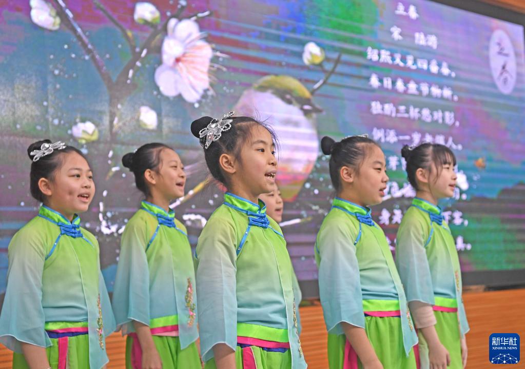 2月21日,孩子们在广西南宁市滨湖路小学表演情景诵读。
