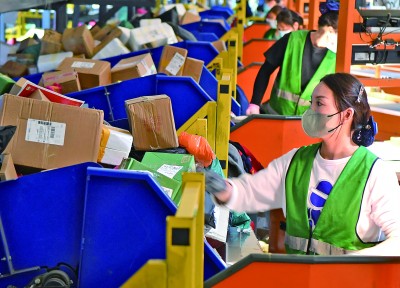 工作人员在中国邮政速递物流郑州邮件处理中心进行分拣作业。新华社记者李嘉南摄