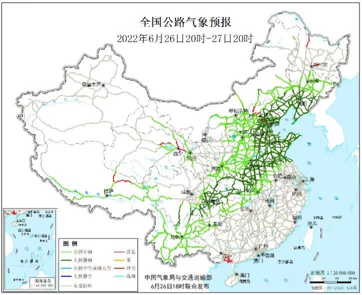 交通运输部出行提示:6月26日20时至27日20时,四川盆地东部和南部、重庆大部、陕西东南部、湖北西部、河南中东部、山东、苏皖北部、北京、天津、河北中东部、辽宁、吉林东南部、内蒙古东南部等地有大到暴雨,其中,四川盆地东北部、重庆西部和北部、山东中部、河南东部、辽宁东部等地的部分地区有大暴雨。另外,黑龙江北部和南部、河北西北部、青海东北部、西藏北部、广西东南部局地有雾。