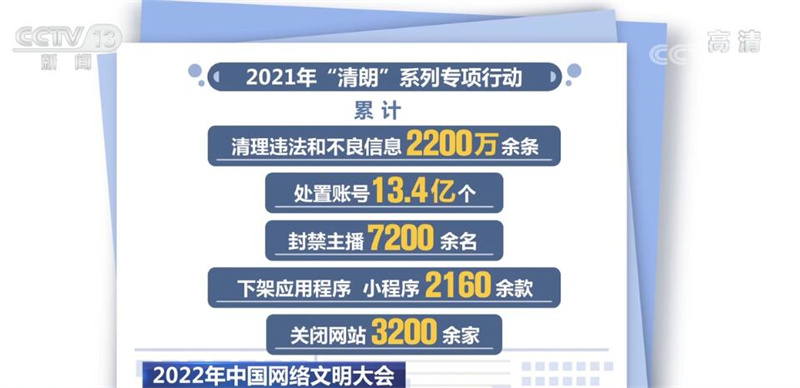 据介绍,2021年“清朗”系列专项行动累计清理违法和不良信息2200万余条,处置账号13.4亿个,封禁主播7200余名,下架应用程序、小程序2160余款,关闭网站3200余家。对于网上互撕谩骂、造谣攻击、攀比炫富、诱导未成年人应援消费等突出问题,制定下发了《关于进一步加强饭圈乱象治理的通知》,指导网站平台完善社区规则,规范公司网络行为,切实推动网络文化实现良性可持续发展。