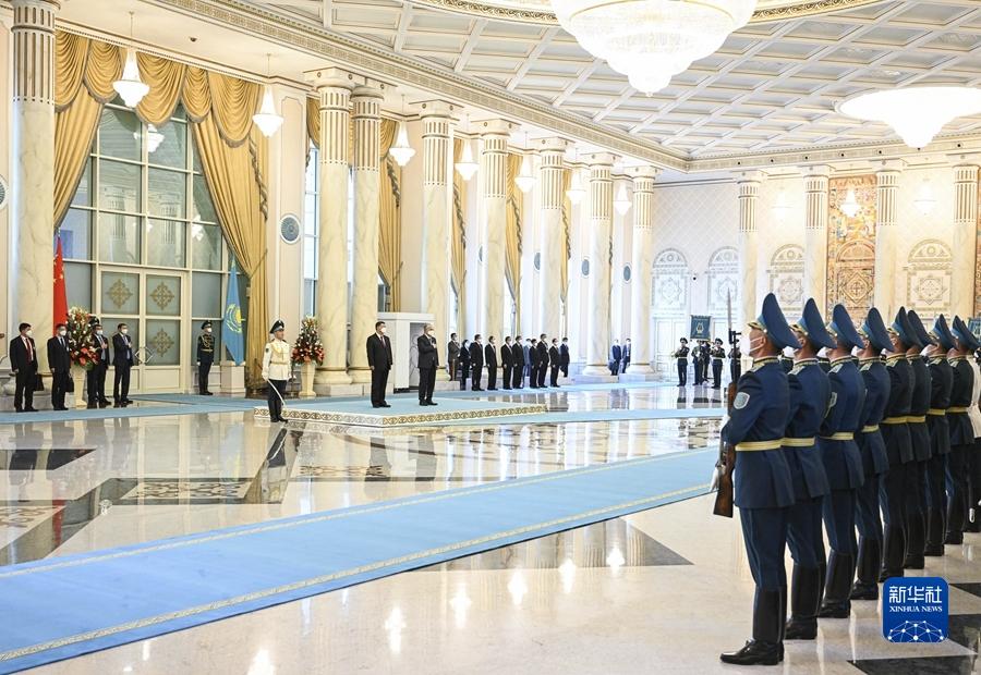 习近平乘坐的国宾车队在摩托车队护卫下抵达总统府。托卡耶夫总统在下车处热情迎接。两国元首共同步入总统府大厅。托卡耶夫为习近平举行隆重欢迎仪式。两国元首共同登上检阅台,军乐团奏中哈两国国歌。习近平在托卡耶夫陪同下检阅仪仗队。